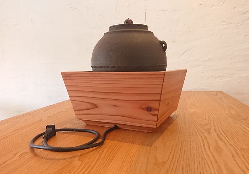 当店(Arun)では火や電熱線の無いヒーターで鉄釜を加熱します。そこで敢えて木製の風炉を製作し、使用しています。